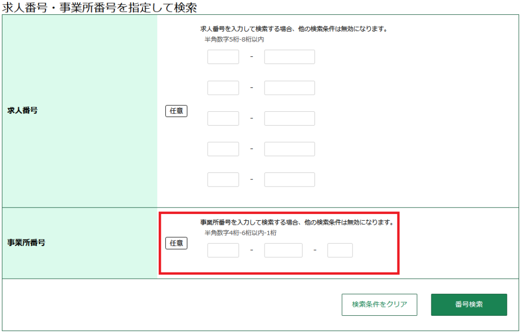ページ下部の「求人番号・事業所番号を指定して検索」の「事業所番号」に「2801-123898-9」を入力し、ページ右下緑色の「番号検索」を押下すると、弊社で募集中の求人一覧が表示されます。